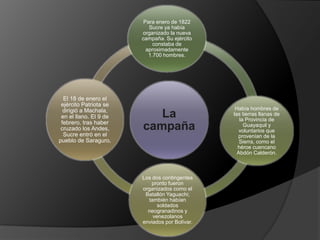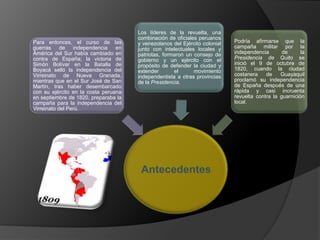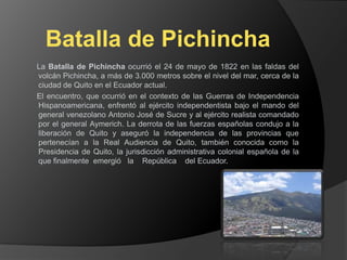 La Batalla de Pichincha ocurrió el 24 de mayo de 1822 en las faldas del volcán Pichincha cerca de Quito, Ecuador. El ejército independentista liderado por el general Antonio José de Sucre derrotó al ejército realista español comandado por el general Aymerich, asegurando así la independencia de las provincias que conformarían posteriormente la República del Ecuador. La batalla se desarrolló en terreno montañoso y empinado con poco espacio para maniobrar, y ambos bandos sufri