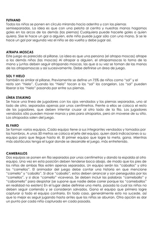 El documento presenta una variedad de juegos de alta actividad para niños, incluyendo Gorila Enjaulado, El Túnel, Cuerpo a Tierra y Hermanos de, entre otros. Los juegos involucran correr, agacharse, pasar objetos y trabajar en equipo. El objetivo es mantener a los niños entretenidos y en movimiento a través de reglas simples.