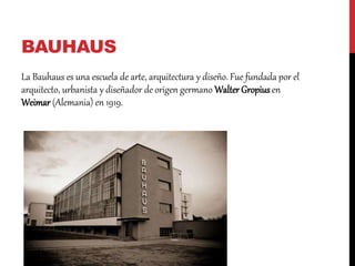 La Bauhaus fue una escuela de arte, arquitectura y diseño fundada en 1919 en Alemania por Walter Gropius. La escuela combinó las artes y oficios para eliminar las diferencias entre artistas y artesanos. Aunque tuvo éxito inicialmente, fue criticada por conservadores y cerrada en 1925 debido a problemas políticos. Se reabrió pero finalmente fue cerrada por los nazis en 1933. La Bauhaus sentó las bases del diseño industrial y gráfico moderno.