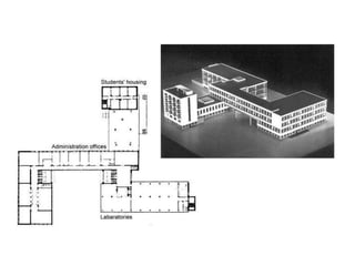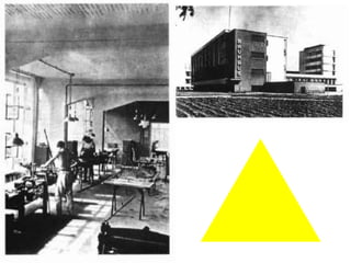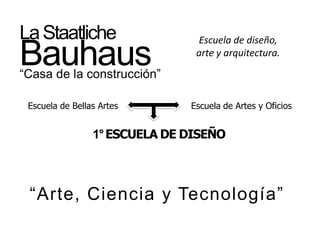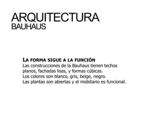 La Bauhaus fue una escuela de arte, diseño y arquitectura fundada en Alemania en 1919 y cerrada por los Nazis en 1933. Comenzó en Weimar con un enfoque experimental, luego se mudó a Dessau donde construyó edificios arquitectónicos innovadores con formas cúbicas, techos planos y colores neutros. Finalmente, muchos maestros de la Bauhaus como Gropius, Mies van der Rohe y Moholy-Nagy emigraron a los Estados Unidos donde influyeron en el diseño moderno después de la guerra.