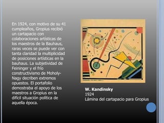 El documento resume la historia de la Bauhaus, la escuela de arte y diseño alemana fundada en 1919 por Walter Gropius en Weimar. La Bauhaus buscaba integrar las artes y la artesanía bajo la primacía de la arquitectura. Trasladó su sede a Dessau en 1925 y cerró en 1933 debido a la presión nazi. Muchos maestros emigraron a Estados Unidos, donde tuvieron gran influencia en la educación y el diseño. La Bauhaus tuvo un enfoque multidisciplinario y buscaba