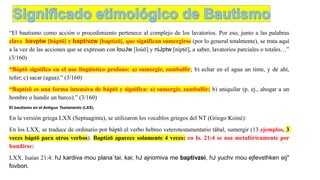 El documento analiza la naturaleza del bautismo, enfatizando que debe realizarse en el nombre del Padre, del Hijo y del Espíritu Santo, como un símbolo de purificación y entrada en la fe cristiana. Se ofrece una visión histórica y teológica sobre el bautismo, diferenciando entre su práctica en el Antiguo Testamento y su interpretación en el Nuevo Testamento, donde se establece que no es el acto en sí, sino la fe en Cristo lo que otorga la salvación. Además, se subraya que el bautismo es una renuncia al mundo y una declaración pública de la intención de seguir a Cristo.