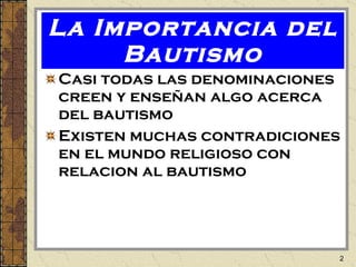 El documento discute el bautismo bíblico versus las opiniones denominacionales. Explica que el bautismo bíblico es por inmersión en agua en el nombre de Jesucristo para el perdón de pecados, mientras que las denominaciones practican el bautismo por aspersión con otros propósitos. También aclara lo que el bautismo no puede hacer, como cambiar el corazón o librar de tentaciones, y lo que sí puede hacer, como unir a Cristo, dar una nueva vida y salvar el alma.