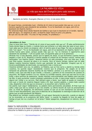 Este documento resume un pasaje del Evangelio de Marcos sobre el bautismo de Jesús. Juan el Bautista reconoce que Jesús es más poderoso que él y que su misión es preparar el camino para Jesús. Al ser bautizado, Jesús ve el cielo abrirse y al Espíritu Santo descender sobre él en forma de paloma, y oye una voz del cielo que lo declara Hijo amado de Dios. El documento luego insta a la Iglesia a aprender de Juan el Bautista a ser humildes voceros de la Palabra de