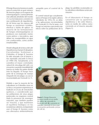 El documento describe las claves para el éxito del hongo Beauveria bassiana como controlador biológico de la broca del café. Se destaca la importancia de seleccionar cepas altamente virulentas contra la broca y de garantizar la calidad de las formulaciones a través de pruebas rigurosas. También se enfatiza la ventaja de usar mezclas de cepas en lugar de cepas individuales, ya que esto aumenta la eficacia del control. Finalmente, se resalta que para que el hongo funcione bien en el campo, es crucial que los productores y