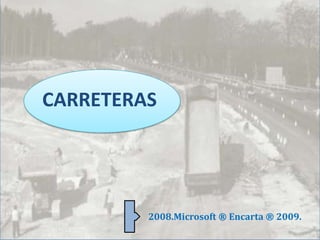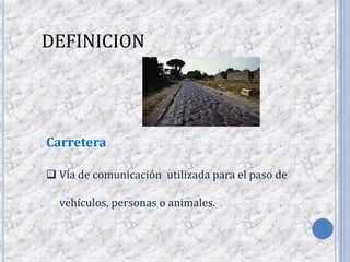 Este documento describe los tipos de carreteras, incluyendo carreteras convencionales, autopistas y autovías. También discute los factores importantes a considerar en la ingeniería de carreteras modernas como la inclinación del terreno, la capacidad del pavimento y la predicción del uso. Además, enumera las condiciones para construir una carretera moderna como líneas rectas, evitar áreas congestionadas y mejorar la seguridad.