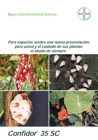 Confidor 35 SC es un insecticida sistémico efectivo contra insectos chupadores y minadores en cultivos y plantas ornamentales. Tiene ventajas como acción sistémica excelente, alta efectividad contra plagas comunes, baja toxicidad, y puede aplicarse por follaje o riego al suelo. Se recomienda su uso contra pulgones, cochinillas, trips, mosca blanca y minador de la hoja en cultivos como clavel, rosal y crisantemo.