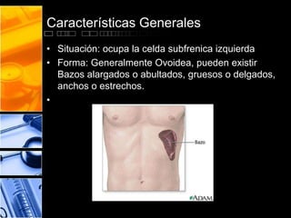 Este documento describe las características generales del bazo, incluyendo su situación, forma, dimensiones, peso, color y medios de fijación. Explica su configuración externa y relaciones, con tres caras, bordes, extremidades y constitución anatómica con tres envolturas. Finalmente, resume su vasculación e inervación, con la arteria, venas y nervio que lo irrigan.