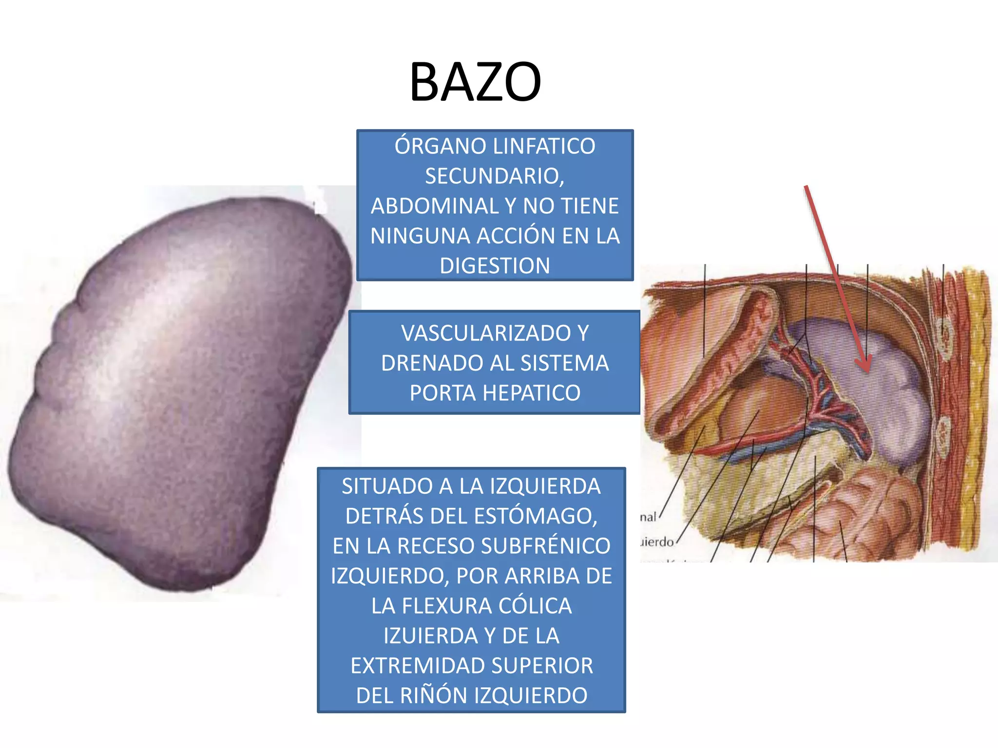 El bazo es un órgano linfático secundario situado en la cavidad abdominal detrás del estómago. Mide aproximadamente 12 cm de largo, 6 cm de ancho y 3 cm de espesor. Está irrigado por la arteria esplénica y drenado por la vena esplénica al sistema portal hepático. No tiene función en la digestión.