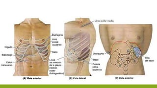 El documento resume la anatomía del bazo, incluyendo su origen embriológico, localización, relaciones, irrigación sanguínea, inervación, composición y funciones. El bazo se desarrolla a partir del mesénquima del mesogastrio izquierdo y se localiza en el hipocondrio izquierdo, en contacto con el estómago, riñón izquierdo y diafragma. Recibe irrigación de la arteria esplénica y drena a través de la vena esplénica, desempeñando funciones inm