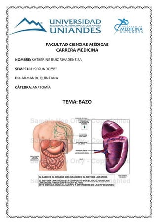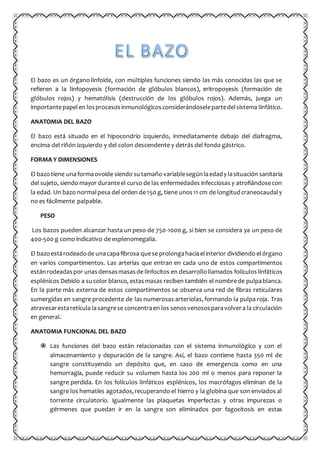 El documento describe la anatomía y función del bazo. El bazo es un órgano linfoide ubicado en el hipocondrio izquierdo debajo del diafragma. Tiene una forma ovoide y múltiples funciones relacionadas al sistema inmunológico como la formación de glóbulos blancos, destrucción de glóbulos rojos viejos y almacenamiento temporal de sangre. La irrigación del bazo ocurre a través de la arteria esplénica que se divide en ramas más pequeñas al llegar al órgano.