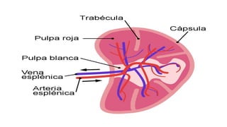 El documento describe la anatomía y función del bazo. El bazo está dividido en tres zonas: la zona marginal, compuesta principalmente de macrófagos; la pulpa blanca, formada por linfocitos y nódulos linfáticos; y la pulpa roja, con una estructura esponjosa formada por senos y cordones. El bazo filtra la sangre, forma y madura linfocitos, elimina material extraño, realiza fagocitosis, destruye eritrocitos y captura y presenta antígenos a linfocitos T