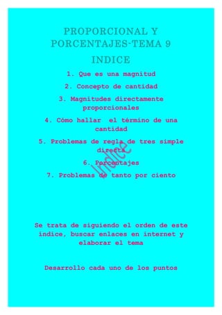 Este documento presenta un índice de 7 puntos sobre proporcionalidad y porcentajes. Explora conceptos como magnitudes, cantidades directamente proporcionales, regla de tres simple directa y porcentajes. El documento desarrollará cada punto del índice buscando enlaces en internet y presentando ejemplos numéricos para reforzar los conceptos.