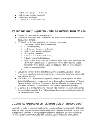 La Suprema Corte de Justicia de la Nación es el máximo tribunal constitucional de México y cabeza del Poder Judicial de la Federación. Tiene la responsabilidad de defender la Constitución, mantener el equilibrio entre los poderes y resolver asuntos de gran importancia para la sociedad de manera definitiva. El Poder Judicial de la Federación representa al guardián de la Constitución y el protector de los derechos fundamentales. Está integrado por la Suprema Corte, tribunales federales y juzgados de distrito, y su administración está a cargo del