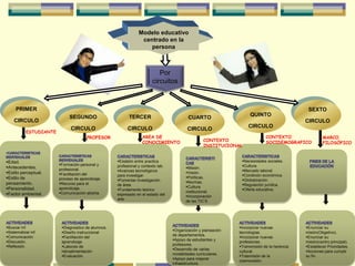 Este documento describe un modelo educativo centrado en la persona con seis círculos concéntricos que representan los diferentes elementos del proceso educativo: 1) el estudiante en el centro, 2) el profesor, 3) el área de conocimiento, 4) el contexto institucional, 5) el contexto sociodemográfico y 6) el marco filosófico. Cada círculo describe las características y actividades de cada elemento educativo y cómo interactúan para lograr los objetivos de aprendizaje del estudiante.