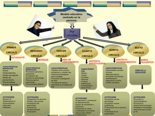 Este documento describe un modelo educativo centrado en la persona con seis círculos concéntricos que representan los diferentes elementos del proceso educativo: 1) El estudiante en el centro, 2) el profesor, 3) el área de conocimiento, 4) el contexto institucional, 5) el contexto sociodemográfico y 6) el marco filosófico. Cada círculo describe las características y actividades de cada elemento educativo y cómo interactúan para lograr los objetivos de aprendizaje del estudiante.