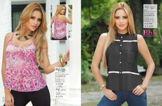 Este documento presenta una lista de blusas, camisas y accesorios como collares y cinturones de diferentes marcas y estilos. Cada artículo incluye una descripción breve, el precio, tallas disponibles y otros detalles como el material, color y marca fabricante. La lista contiene aproximadamente 40 artículos de ropa y accesorios para mujer.