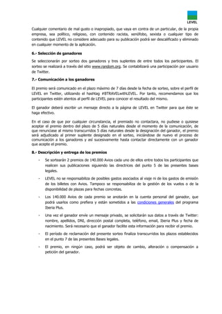 Este documento presenta las bases de un concurso organizado por LEVEL para promocionar sus destinos. Los participantes deben subir un selfie en el stand de LEVEL en la feria B>Travel en Barcelona con la mención al perfil de LEVEL en Twitter y el hashtag #BTRAVELwithLEVEL. Se sortearán dos premios de 140,000 Avios cada uno entre los participantes para usar en vuelos de LEVEL. El concurso durará del 21 al 23 de abril de 2017 y los ganadores serán anunciados una semana después a través de Twitter.
