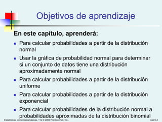 Este documento presenta el Capítulo 6 de un libro de texto sobre estadísticas comerciales básicas. El capítulo cubre distribuciones de probabilidad continuas como la distribución normal, uniforme y exponencial. Explica cómo calcular probabilidades a partir de estas distribuciones y la conversión a la distribución normal estandarizada. También presenta reglas empíricas sobre la dispersión de valores alrededor de la media para la distribución normal.