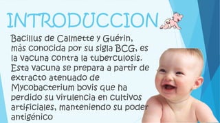 La vacuna BCG se prepara a partir de Mycobacterium bovis atenuado y protege contra la tuberculosis. Está indicada para recién nacidos con peso mayor a 2000 gramos y contactos de menores de 5 años con tuberculosis bacilífera no vacunados. No se administra a recién nacidos con peso menor a 2000 gramos, con enfermedades inmunosupresoras o madres VIH positivas. Tras la vacunación puede causar una leve reacción en el sitio de la inyección que se resuelve espontáneamente.