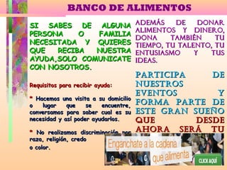 Este documento promueve la donación de alimentos y dinero a un banco de alimentos para ayudar a personas necesitadas. Alienta a los lectores a participar como voluntarios o donando sus talentos y tiempo, ya que la mejor inversión es ayudar a otros siguiendo el mandato de Dios. El banco de alimentos visita a los necesitados en sus hogares para entender sus necesidades y brindar ayuda sin discriminación.