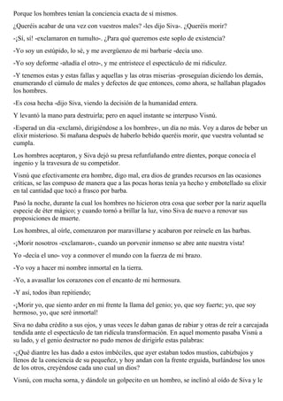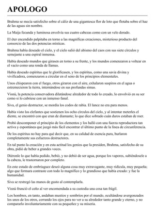 El relato cuenta la creación del universo por parte de Brahma y los dioses Visnú y Siva. Luego de crear mundos y espíritus, Brahma se emborracha y crea a la humanidad, a la que considera frágil y defectuosa. Los hombres quieren morir por vergüenza a su pequeñez, pero Visnú les da un elixir mágico que les da amor propio, haciéndolos creerse fuertes y dignos. Esto enfurece a Siva, pero Visnú le revela que solo les dio