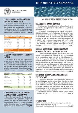 El documento presenta indicadores comerciales de maíz y soja en Argentina. Para maíz en la campaña 2012/13, el saldo exportable fue de 19,4 millones de toneladas, de las cuales se compraron 18,21 millones para exportación. Queda por vender 1,2 millones de toneladas y falta fijar precio para 2,2 millones. Para soja 2013/14, la producción estimada es de 53,51 millones de toneladas, de las cuales se compraron 2,08 millones y falta vender 50,6 millones y fij