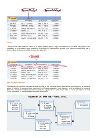 El documento proporciona una introducción a las bases de datos relacionales en Access, definiendo términos clave como datos, tablas, campos, registros y claves primarias. También explica cómo crear una base de datos en Access, incluyendo la creación de tablas y la configuración de relaciones entre ellas. Finalmente, describe cómo insertar datos en las tablas creadas.