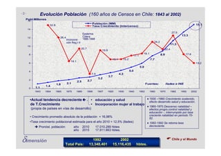 El documento resume la distribución y evolución de la población chilena según los censos desde 1843 hasta 2002. La población total en 2002 fue de 15.1 millones de habitantes, con un crecimiento promedio del 13.2% desde 1992. Las regiones con mayor porcentaje de población son la Región Metropolitana, VIII y V, las cuales suman más del 60% de la población total. Se espera que la población siga creciendo a una tasa del 12.5% para el año 2010.