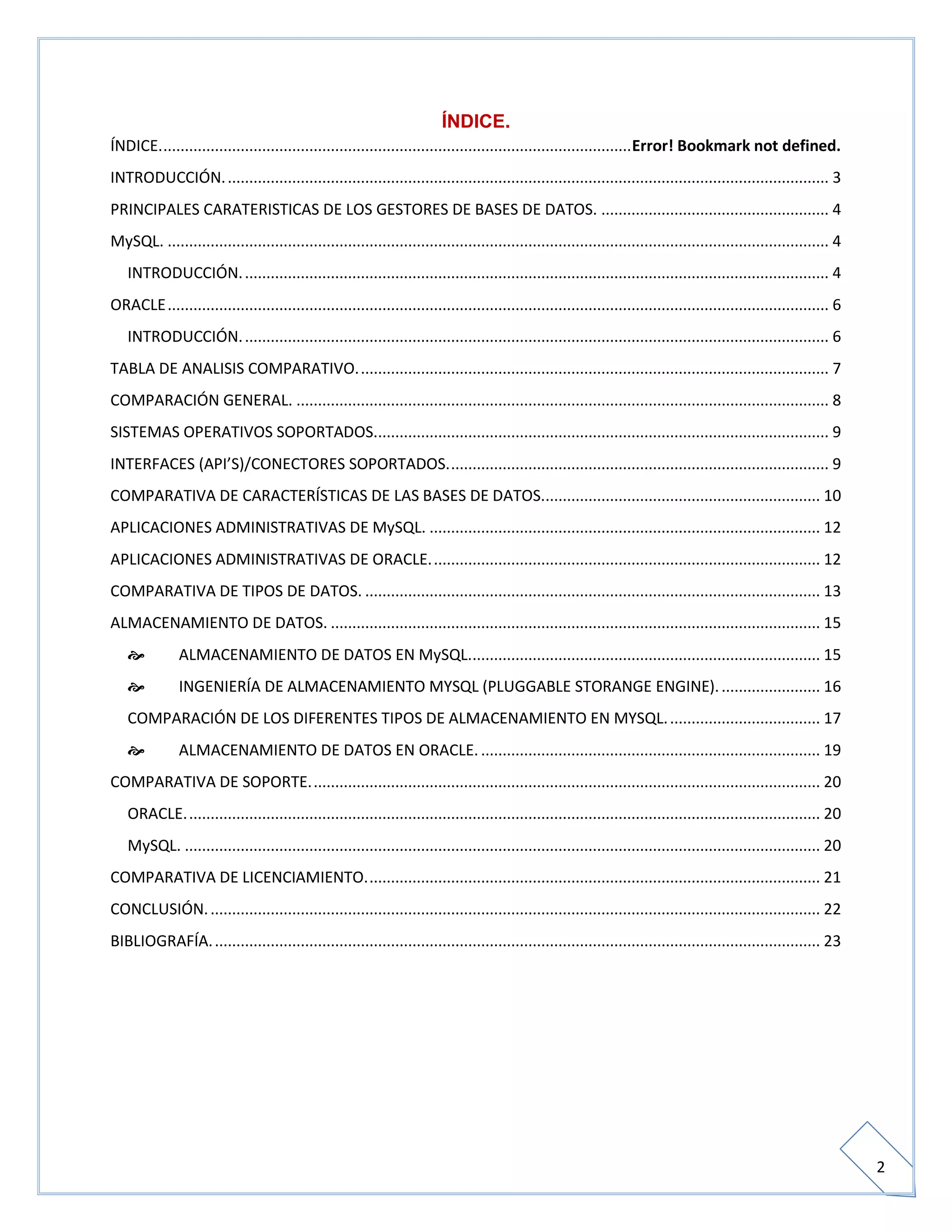 Este documento presenta una comparación entre las bases de datos MySQL y Oracle. Analiza varios puntos clave como soporte, rendimiento, funcionalidad, sistemas operativos compatibles, tipos de datos, almacenamiento de datos, herramientas de gestión, características de seguridad y más. La comparación concluye que MySQL es una opción gratuita y de código abierto mientras que Oracle es una solución robusta pero de pago. Ambas son populares opciones para proyectos que requieran el uso de bases de datos.