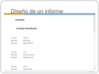 Este documento describe dos vistas de diseño de informes en BD Microbook. La primera vista muestra un informe en blanco para que el usuario ingrese la información. La segunda vista muestra un informe automático generado con datos previamente ingresados en la base de datos.
