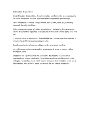 La empresa desea informatizar la información sobre sus vendedoras, catálogos, coordinadores y productos. Se conoce el código, nombre, zona y contacto de cada vendedora, así como los detalles de cada catálogo. Los coordinadores supervisan vendedoras de una zona en particular. Finalmente, cada producto tiene un código, descripción y costo.