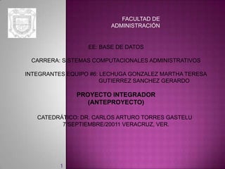 Este documento presenta un anteproyecto para automatizar el sistema manual de registro de ventas y flujo de inventario de la tienda NENITA BOUTIQUE. El sistema propuesto utilizará una base de datos con tablas que incluirán información de clientes, órdenes, inventario y reportes. Esto permitirá llevar un mejor control del inventario, agilizar los procesos y emitir reportes de ventas de manera automática. El sistema se desarrollará utilizando herramientas como CASE Studio, IB Expert y SQL Editor.