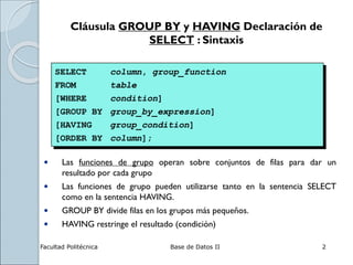 Este documento describe las cláusulas GROUP BY y HAVING en SQL. Explica que GROUP BY divide filas en grupos y HAVING restringe los resultados de los grupos según una condición. También describe las funciones de grupo como COUNT, AVG, MAX, MIN y SUM y cómo se pueden usar en las sentencias SELECT y HAVING.