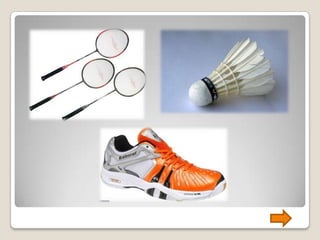 Este documento describe el equipamiento y los sistemas de puntuación del bádminton, así como los diferentes tipos de golpes que se pueden realizar en el juego. Las raquetas son ligeras y están compuestas principalmente de fibra de carbono, mientras que los volantes tienen una forma cónica formada por plumas insertadas alrededor de una base de corcho. Los partidos constan de sets de hasta 30 puntos, necesitándose ganar dos sets para adjudicarse el partido. Se describen golpes de red, media cancha, fondo, defensa y servicio.