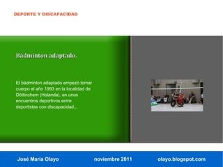 El documento describe el bádminton adaptado para personas con discapacidad. Se originó en Holanda en 1993 y desde entonces ha crecido en popularidad. Hay varias clases basadas en la discapacidad física y las reglas se adaptan para cada clase. El bádminton adaptado ofrece a las personas con discapacidad la oportunidad de competir en este deporte.