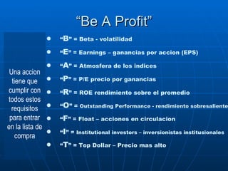 El documento proporciona instrucciones para encontrar acciones que cumplan con los criterios de "Be A Profit" en varios sitios web de finanzas. Estos criterios incluyen una beta menor a 2, ganancias trimestrales de más del 25%, tendencias alcistas en los principales índices, un ratio precio-ganancias menor que el promedio de la industria, una rentabilidad de acciones superior al 15%, un rendimiento superior al 80% en comparación con los pares, menos de 50 millones de acciones en circulación, menos del 50% de las acciones