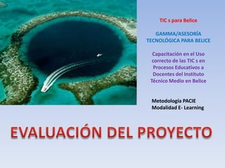 El documento aborda un proyecto de asesoría tecnológica en Belice, enfocado en capacitación a docentes del Instituto Técnico Medio sobre el uso correcto de TIC en educación mediante la metodología PACIE y modalidad e-learning. También incluye una evaluación del proyecto, analizando aspectos como la identificación del problema, la investigación y planificación, la presentación de especificaciones y la elaboración de un plan de seguimiento. Finalmente, evalúa si se utilizaron técnicas y equipos adecuados para la implementación de la solución.