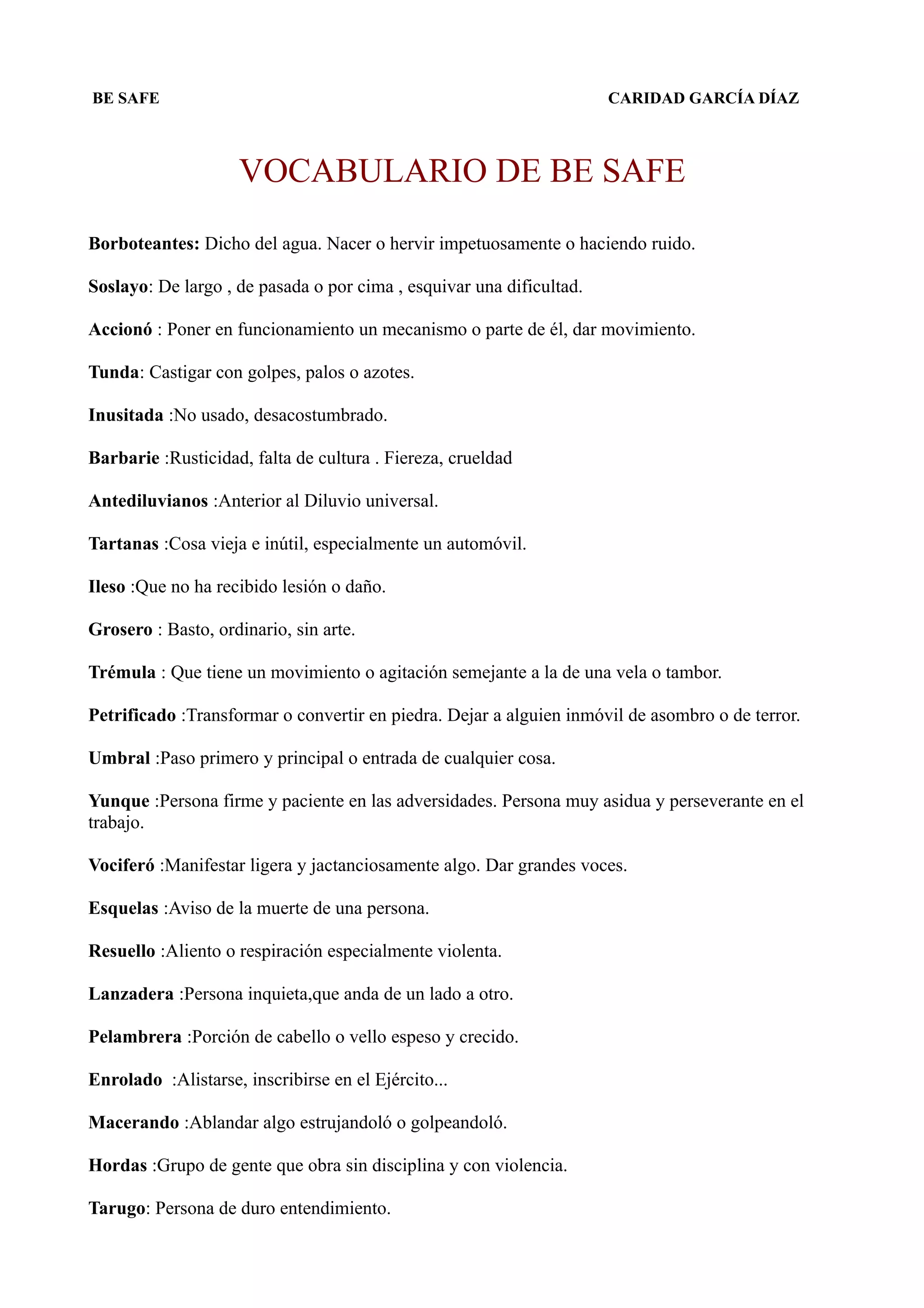 Este documento presenta una lista de vocabulario de la palabra "BE SAFE" con definiciones de más de 50 palabras en español. Las palabras incluyen términos como "borboteantes", "soslayo", "accionó", "tunda", "inusitada", "barbarie" y más.