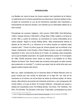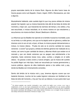 Los Beatles fueron el grupo más importante de la historia de la música popular. Originarios de Liverpool, Inglaterra, revolucionaron la industria musical en la década de 1960 con su sonido innovador y letras ingeniosas. Su música ha trascendido el tiempo y ha influenciado a muchos otros artistas en géneros como el rock, jazz, blues y música clásica. Este documento analizará las características distintivas de la música de los Beatles y cómo ha sido versionada y adaptada a otros estilos musicales.
