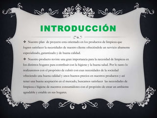 Emprolim S. de R.L. es una empresa de productos de limpieza que busca satisfacer las necesidades de limpieza e higiene de los consumidores mediante la elaboración y distribución de un producto de alta calidad y buenos precios. Su misión es ofrecer un servicio especializado que genere imagen y seguridad para los clientes, y su visión es convertirse en líder del mercado de soluciones de limpieza con productos innovadores.