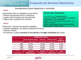 El documento evalúa los servicios electrónicos y la satisfacción de los usuarios del Ayuntamiento de Gijón. Se resumen los principales resultados, incluyendo un aumento en el uso de trámites electrónicos, ahorros de tiempo y costos, y altos niveles de satisfacción de los usuarios. Las encuestas muestran que el 44% prefiere canales electrónicos y el 65% no conoce los servicios disponibles.