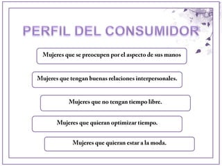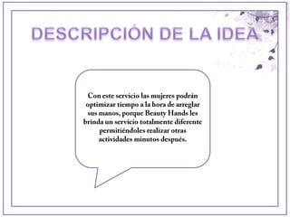 El documento presenta información sobre un negocio de servicios de manicura, incluyendo sus necesidades, canales de distribución, clientes potenciales, competencia, servicios ofrecidos, cantidad de servicios diarios y precios. Busca optimizar el tiempo, estética, comodidad e higiene a través de folletos, internet, revistas y puntos de venta, apuntando a mujeres ejecutivas, universitarias y amas de casa. Su competencia directa son otras manicuristas y la indirecta son salones de belleza.