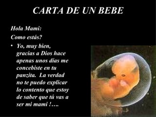La carta es escrita desde la perspectiva de un bebé no nacido dirigiéndose a su madre. El bebé expresa su felicidad por estar formándose en el vientre de su madre, pero también su preocupación por las discusiones y el llanto de su madre. Con el paso de los meses, el bebé nota a su madre cada vez más deprimida hasta que es llevada al doctor y luego al abortorio, donde el bebé es sacado del vientre materno a la fuerza a pesar de sus súplicas. Años después, el bebé observ