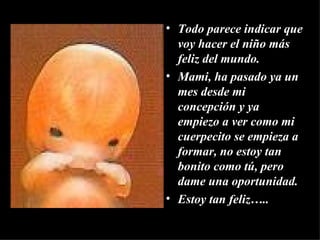 CARTA DE UN BEBE Hola Mami:  Como estás? Yo, muy bien, gracias a Dios hace apenas unos días me concebiste en tu panzita.  La verdad no te puedo explicar lo contento que estoy de saber que tú vas a ser mi mami !….