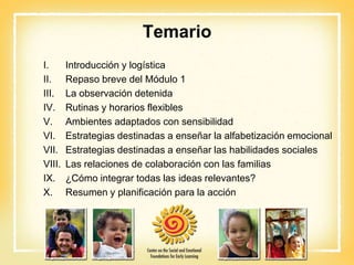 Este documento presenta el temario para el Módulo 2 sobre el apoyo al desarrollo social-emocional de bebés y niños de 1 a 2 años. Incluye secciones sobre rutinas y horarios flexibles, ambientes adaptados con sensibilidad, estrategias para enseñar la alfabetización emocional y habilidades sociales, y colaboración con familias. Los objetivos son discutir la importancia de apoyar el desarrollo social-emocional temprano y describir estrategias como el uso de rutinas, ambientes y herramient