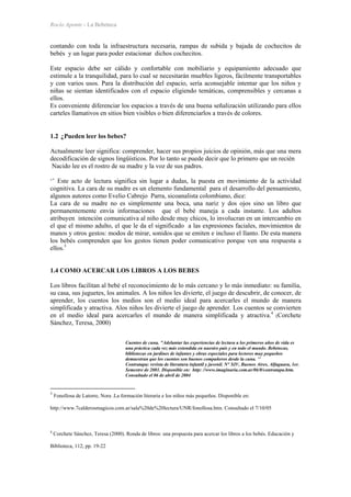 Este documento describe las bebetecas, espacios en bibliotecas diseñados para niños pequeños de 0 a 6 años. Explica que las bebetecas deben contar con colecciones y servicios adecuados para los niños, incluyendo préstamo de libros y charlas para padres. Además, destaca la importancia de que las bebetecas sean espacios tranquilos y estimulantes que permitan a los niños y padres interactuar con los libros desde una edad temprana. Finalmente, señala que los bibliotecarios que trabajan