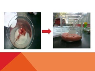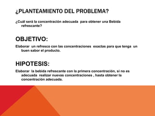 Este documento describe un experimento para determinar la concentración adecuada de ingredientes para elaborar un refresco con buen sabor. Se probaron tres concentraciones diferentes de azúcar, bicarbonato de sodio, ácido cítrico, colorante y saborizante usando agua embotellada. La primera concentración resultó muy ácida, la segunda fue menos ácida pero el sabor aún no era adecuado, y la tercera fue más dulce pero tampoco correcta. Se necesitan más pruebas para encontrar la concentración ideal.