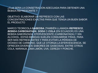 Este documento describe cómo elaborar un refresco con las concentraciones adecuadas para obtener un buen sabor. Explica que se necesita determinar la concentración correcta de azúcar, ácido cítrico, agua, bicarbonato de sodio y saborizante. El método implica probar diferentes porciones de estos solutos en la bebida para determinar cuál sabe mejor. La conclusión es que al cambiar y calcular adecuadamente la concentración de cada componente, el refresco resultante tuvo mejor sabor.