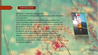 Este documento describe el procedimiento para preparar una bebida refrescante de manera casera variando las concentraciones de los ingredientes. Los estudiantes pesarán y mezclarán azúcar, ácido cítrico, bicarbonato de sodio, colorante y saborizante en diferentes proporciones para lograr el sabor deseado. Probarán múltiples fórmulas y registrarán los resultados para determinar la concentración óptima que produzca una bebida agradable al paladar.